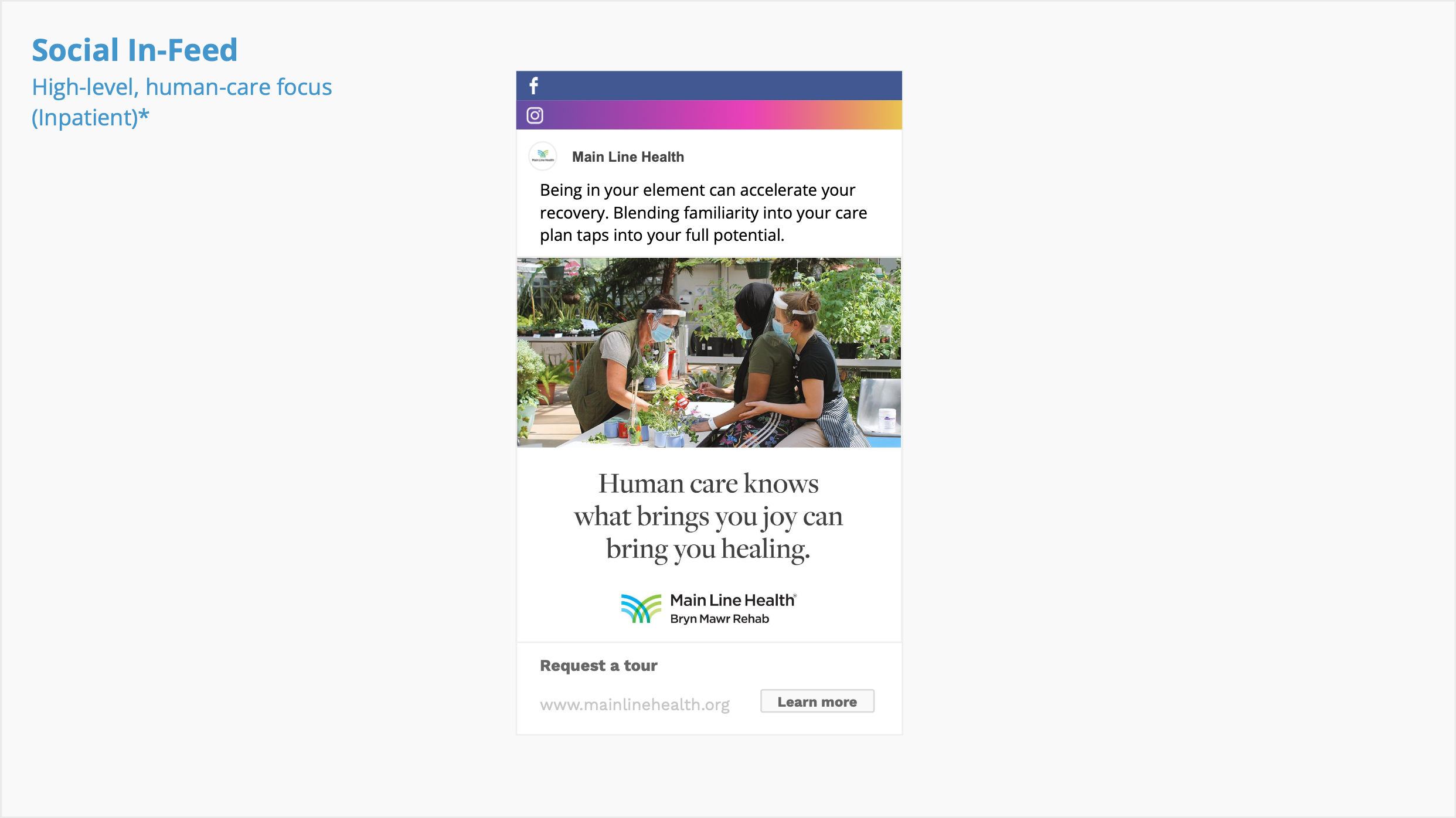 The Ask: Inform audience of the team of experts, equipped with advanced technology, employing an innovative, personalized approach to their recovery across social media channels, streaming audio and OOH patients and their care circles know they can turn to MLH when/if they need exceptional rehabilitation that sees who they are and keeps their life goals in mind.